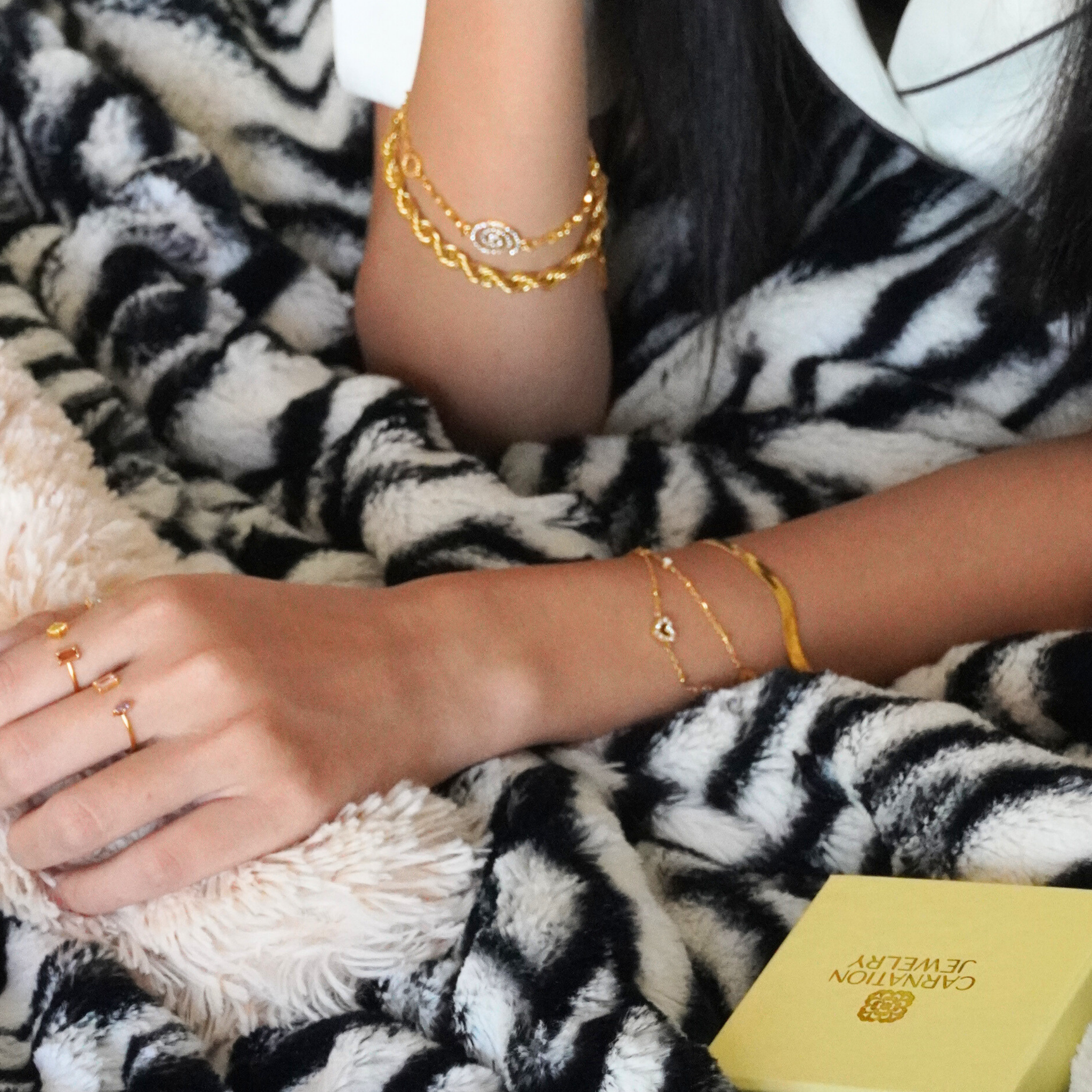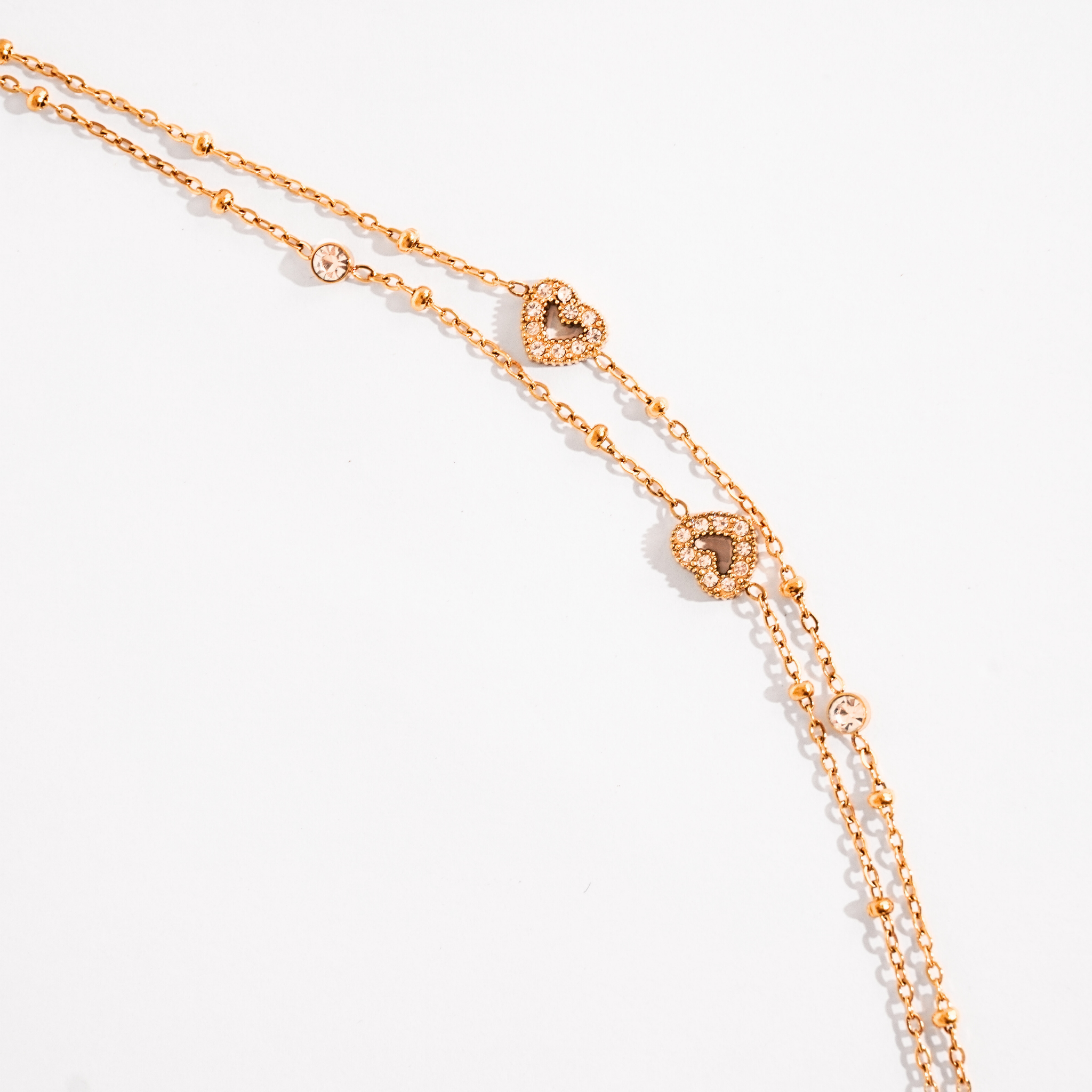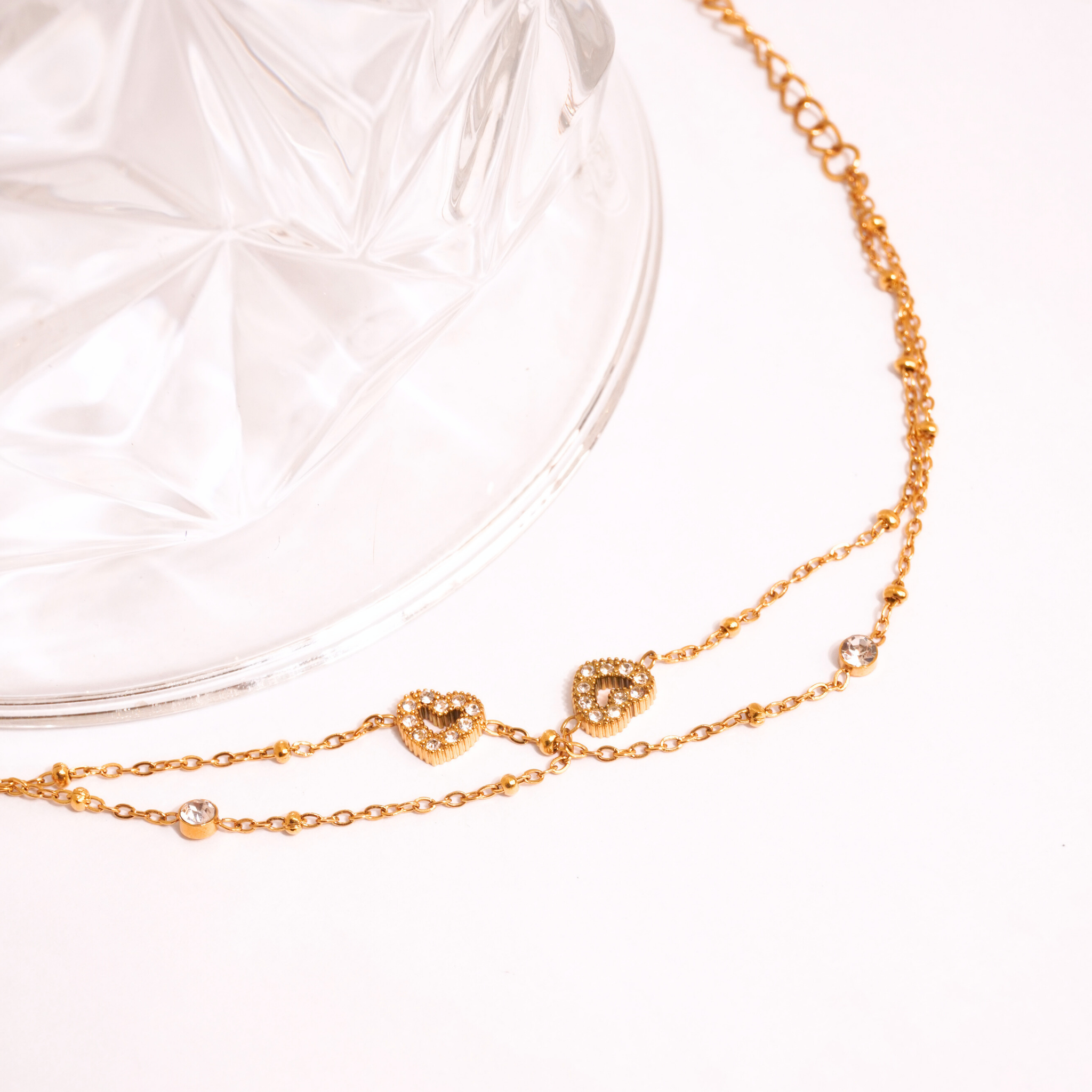 A minimal bracelet featuring twin zircon hearts; subtle, soft, and easy to wear.