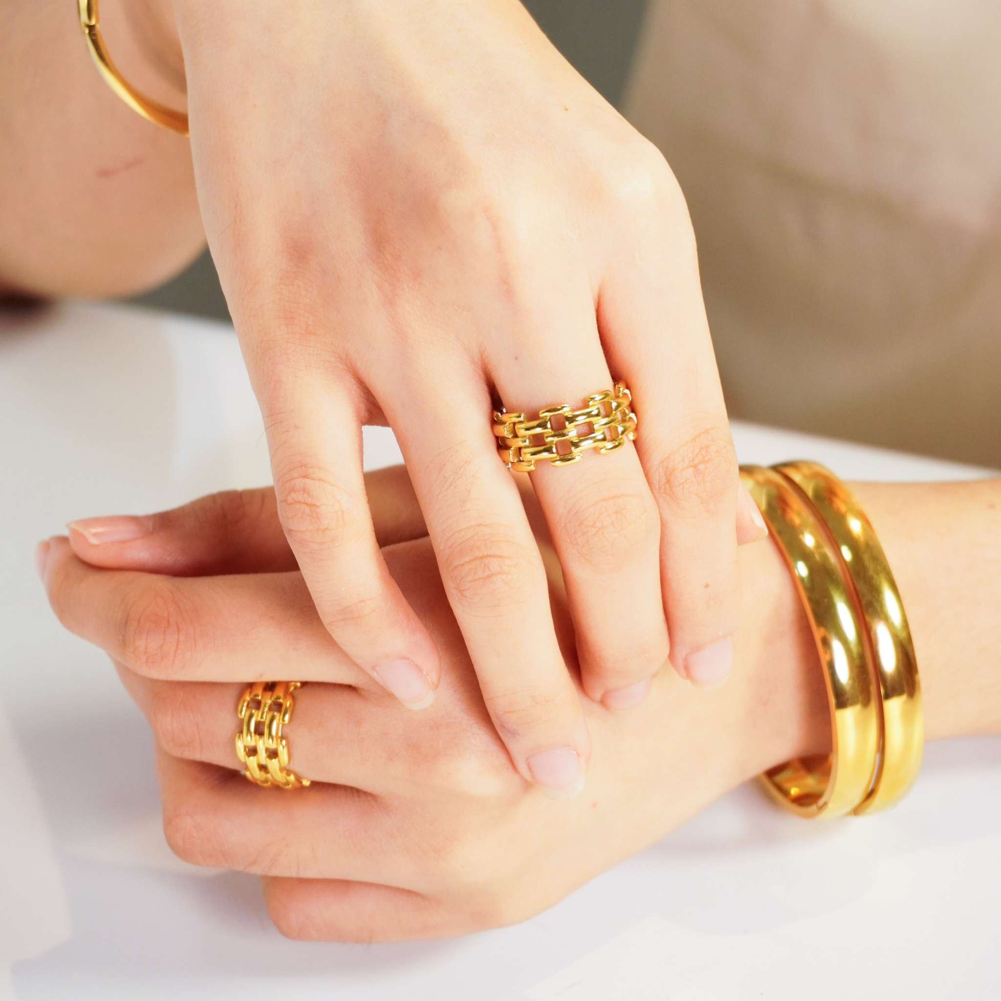 Bold yet refined, the Watchband Ring brings timeless edge to your everyday look, crafted with clean lines and 18k gold PVD finish.